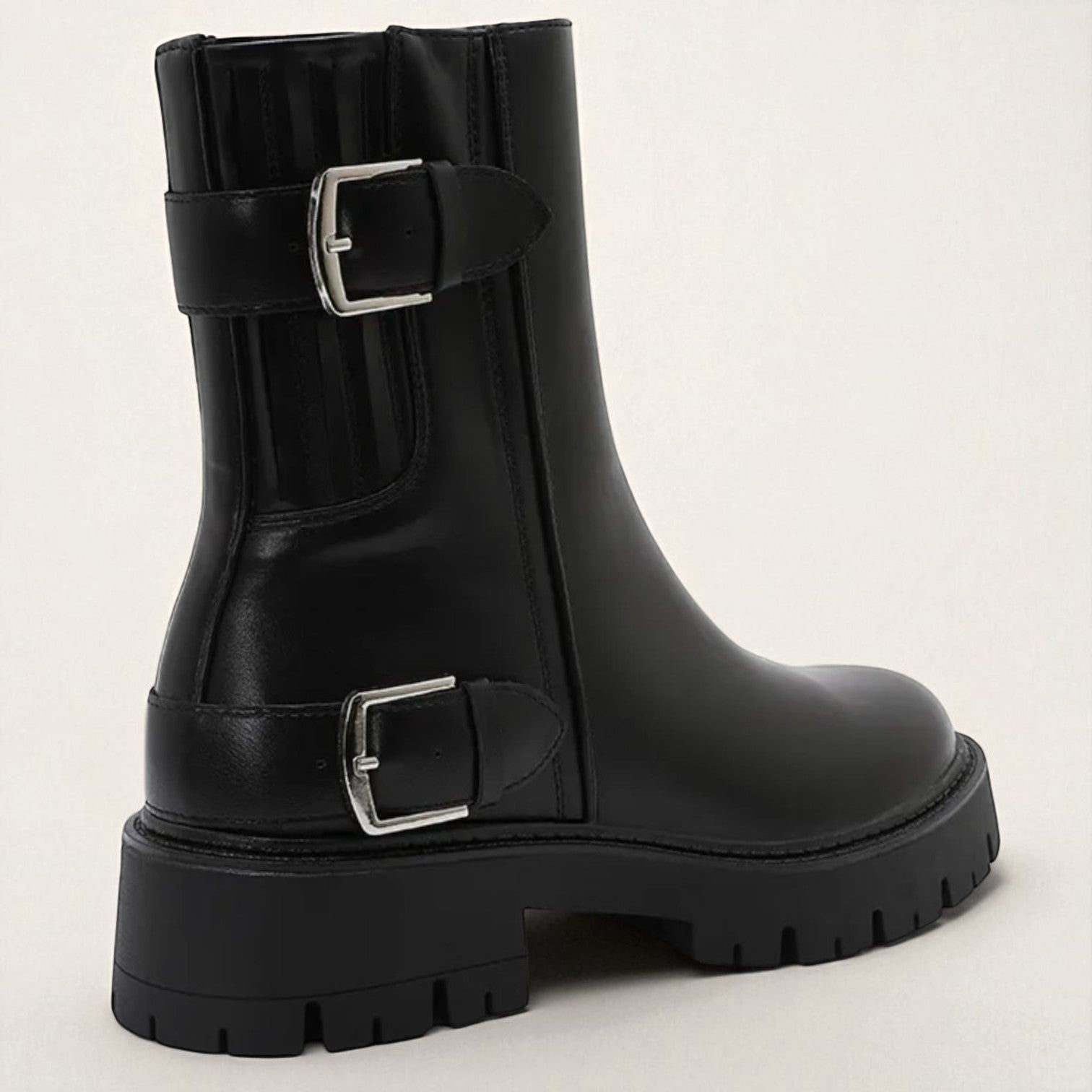 These black vegan leather ankle boots combine style with functionality. Featuring elastic-covered gussets and silver buckle accents, they offer a secure yet flexible fit. The padded inner and flexible sole ensure comfort for extended wear, making them a reliable choice for both everyday and dressier occasions.