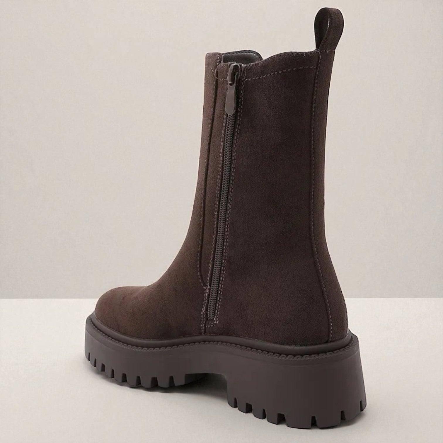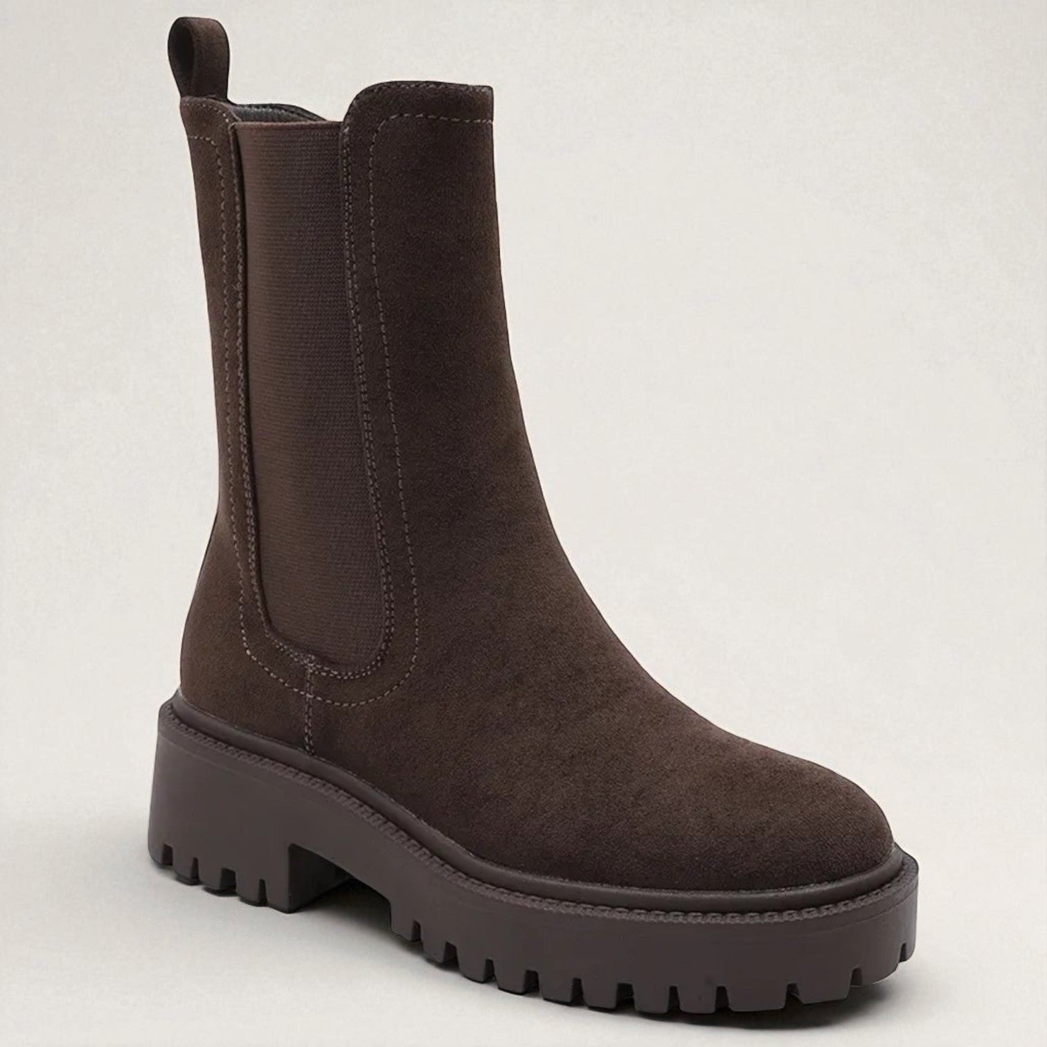 The Chocolate Brown Chunky Sole Chelsea Boot features splash-proof faux suede, an elastic gusset, padded inner, and flexible sole for comfortable, practical, and stylish all-day wear.